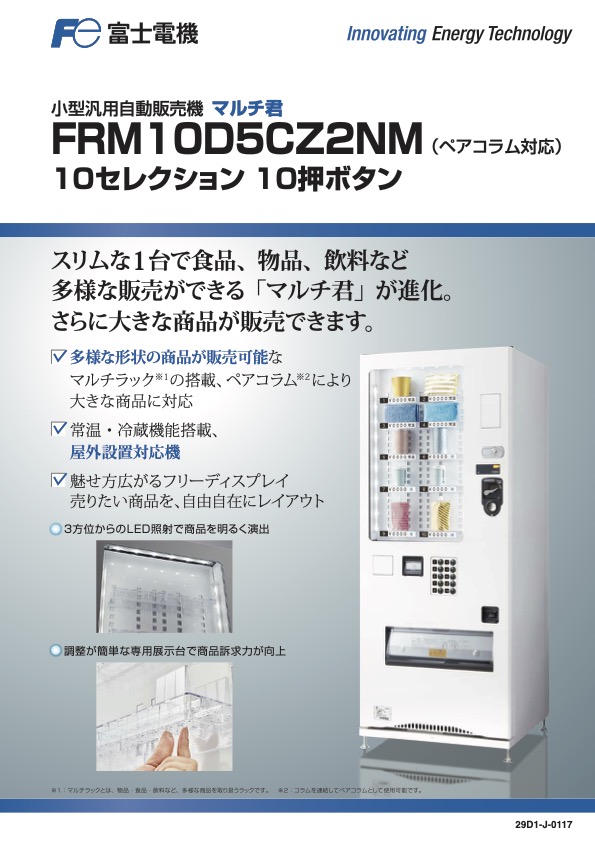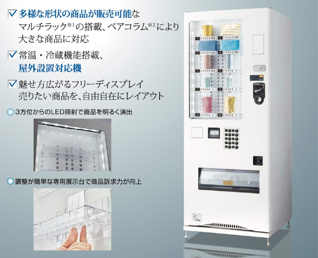スリムな 1 台で食品、物品、飲料など 多様な販売ができる「マルチ君」が進化。 さらに大きな商品が販売できます 特徴 多様な形状の商品が販売可能なマルチラックの搭載、ペアコラムにより大きな商品に対応 常温・冷蔵機能搭載、屋外設置対応機 魅せ方広がるフリーディスプレイ 売りたい商品を、自由自在にレイアウト! カタログ(PDF) 食品汎用自動販売機FNS130 印刷式券売機BT-L350B